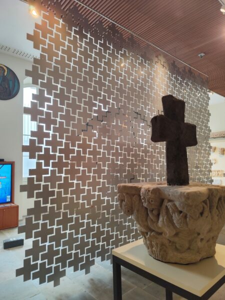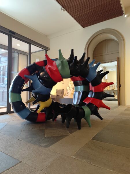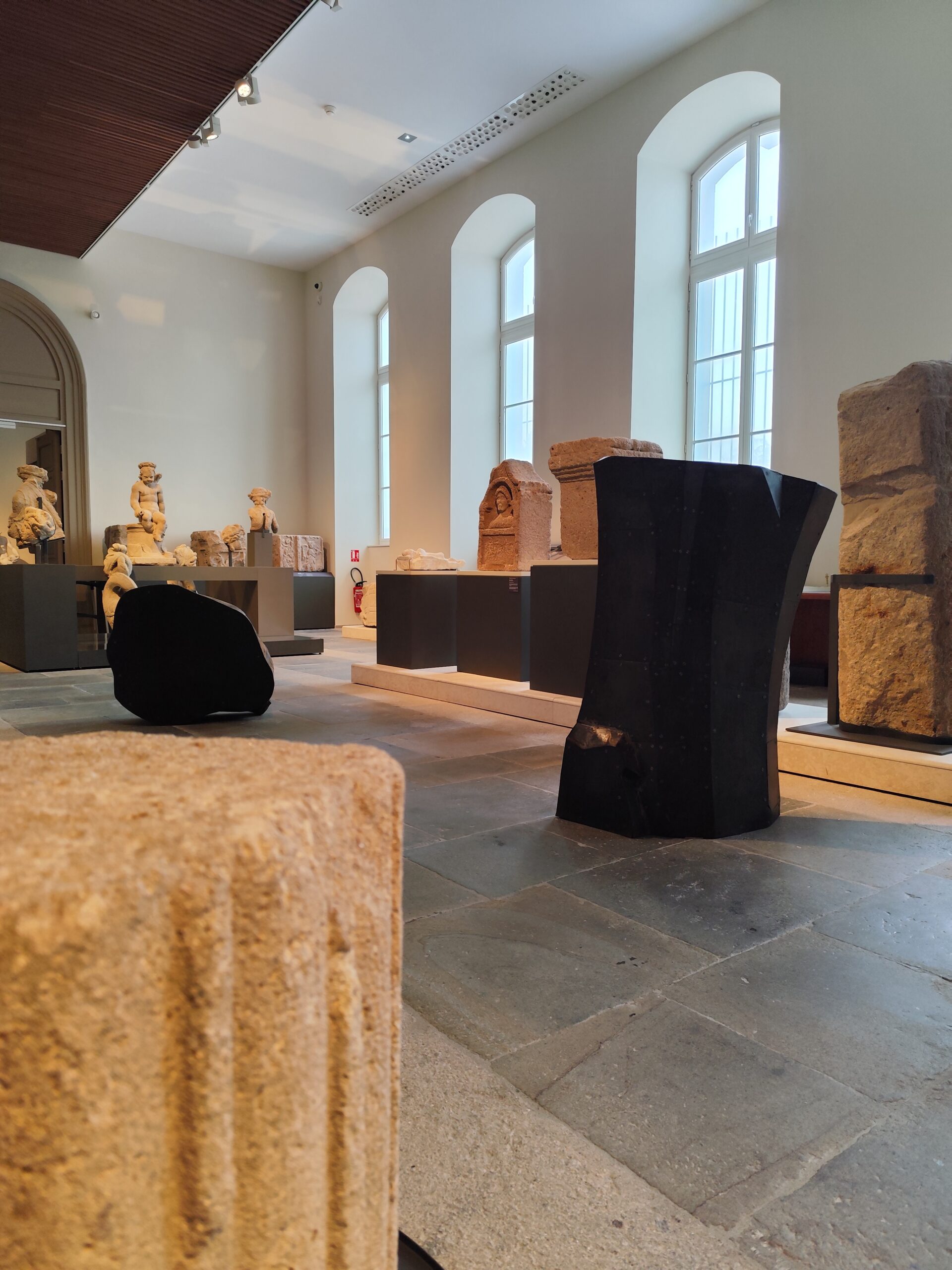 Présentées à même le sol pour la plupart d’entre elles, sans aucun socle, ni aucun cadre pour les structurer, les œuvres dialoguent dans une relation fluide avec les espaces du musée. Si les couleurs de l’œuvre de Étienne Bossut contrastent avec le blanc immaculé des sculptures du hall ancien, sa forme en spirale invite le spectateur à l’appréhender en se déplaçant comme il le ferait autour des œuvres classiques qui l’entourent. Dans la galerie gallo-romaine, la forme des œuvres de Roland Cognet répond, quant à elle, à celle des bornes miliaires et chapiteaux antiques tandis que la couleur de l’acier qui les recouvre prolonge la couleur du sol en pierre. Plus loin, la surface réfléchissante du grand rideau en plexiglas de Carla Arocha absorbe les collections de sculpture médiévale quand, à l’étage, l’installation d’Aurélie Pétrel se développe dans la salle en prenant littéralement appui sur les murs du musée créant un dialogue fort avec les portraits du XVIIème siècle.