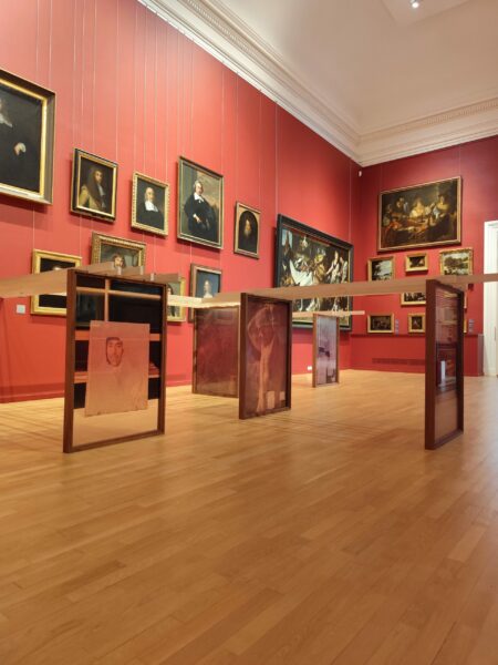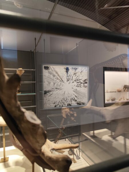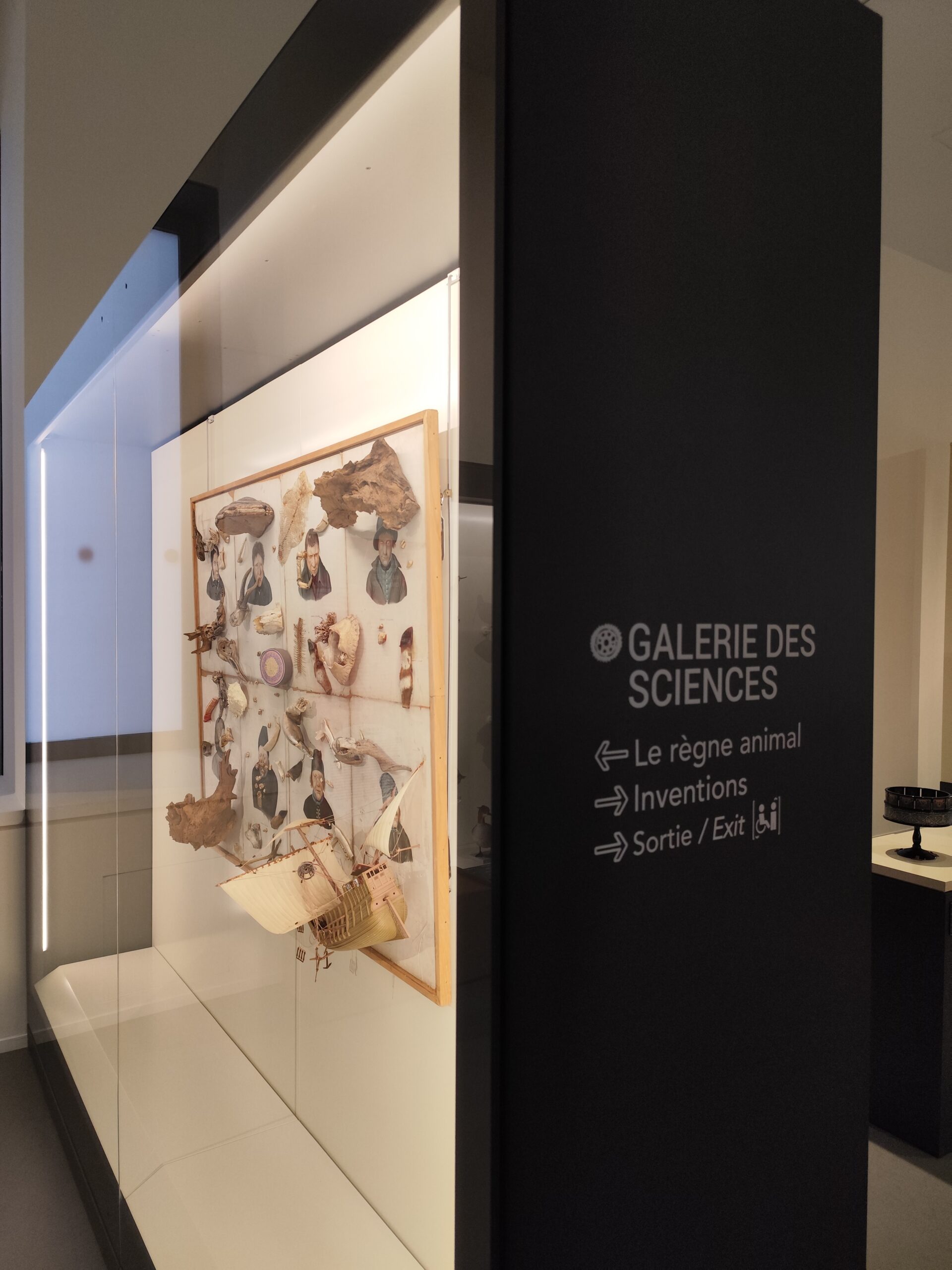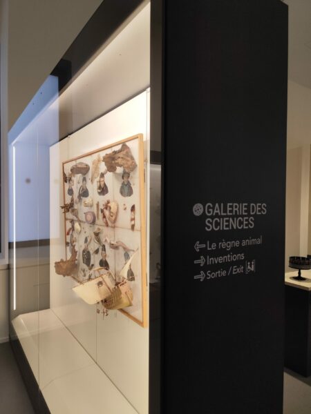 Deux œuvres peuvent faire figure d’exception, celles d’Abdelkader Benchamma et de Daniel Spoerri présentées dans la galerie des sciences et qui s’offre au spectateur dans une typologie assez classique. Cependant, les grands formats de ces œuvres, la puissance du trait d’Abdelkader Benchamma qui donne l’impression de vouloir exploser les limites du cadre pour se répandre au-delà, les collages d’éléments en volume de Daniel Spoerri qui débordent du cadre de l’œuvre, poursuivent une même histoire de la création contemporaine qui a cherché depuis de nombreuses décennies à sortir de la bidimensionnalité de la peinture, engageant un nouveau rapport au spectateur et à l’espace d’exposition.